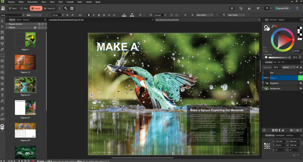 O novo Affinity reúne em um único aplicativo o que antes eram três programas separados. Nele, você encontra ferramentas para vetores, edição de fotos e criação de layouts, tudo em um só lugar. As funções de edição de imagens competem bem com GIMP, Photoshop e Krita, enquanto os recursos vetoriais lembram o Illustrator e o Inkscape. A navegação também ficou simples: basta trocar entre as abas Vetor, Pixel ou Layout no topo da janela.